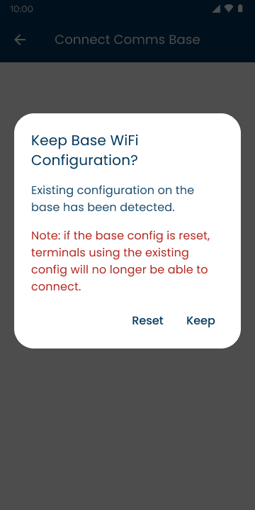 The terminal will now work through the connection steps. When it gets to step 3 of 4, ‘Configure Base Wi-Fi’, it may ask if you want to keep base Wi-Fi configuration, tap ‘Keep’. (Note: If this is the first time setting up or if you have done a factory reset of the base this step won’t appear).